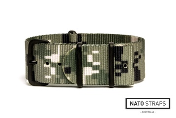 Our "Arctic Blue" winter snow camo NATO strap features waterproof ballistic nylon, and has tactical black "PVD" buckles.