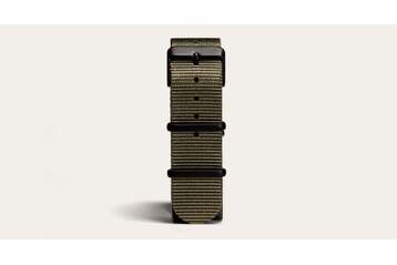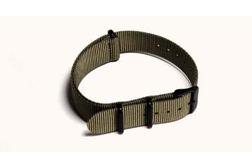 This green G10 NATO strap features matte-black PVD coated buckles and keepers.